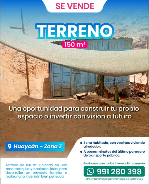 TERRENO EN VENTA HUAYCÁN (ZONA Z) Se vende terreno de 150 m², ubicado por el último paradero de carros públicos de la Zona Z Huaycán, en zona habitada, con vecinos viviendo alrededor. Buen metraje, ideal para proyecto de vivienda. Área: 150 m² Ubicación: Huaycán Zona Z Información solo por mensaje de WhatsApp No llamadas Escríbenos al WhatsApp: 991 280 398 Precio y detalles se brindan por mensaje interno / WhatsApp